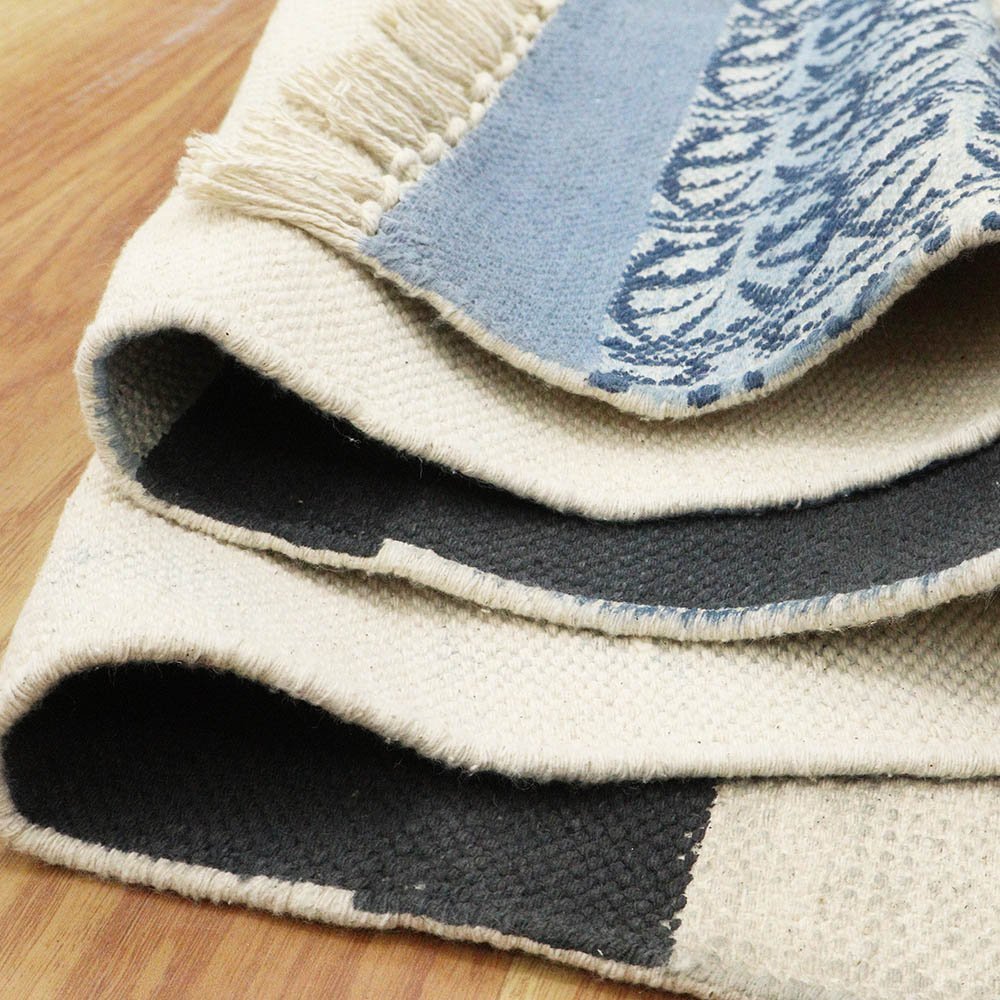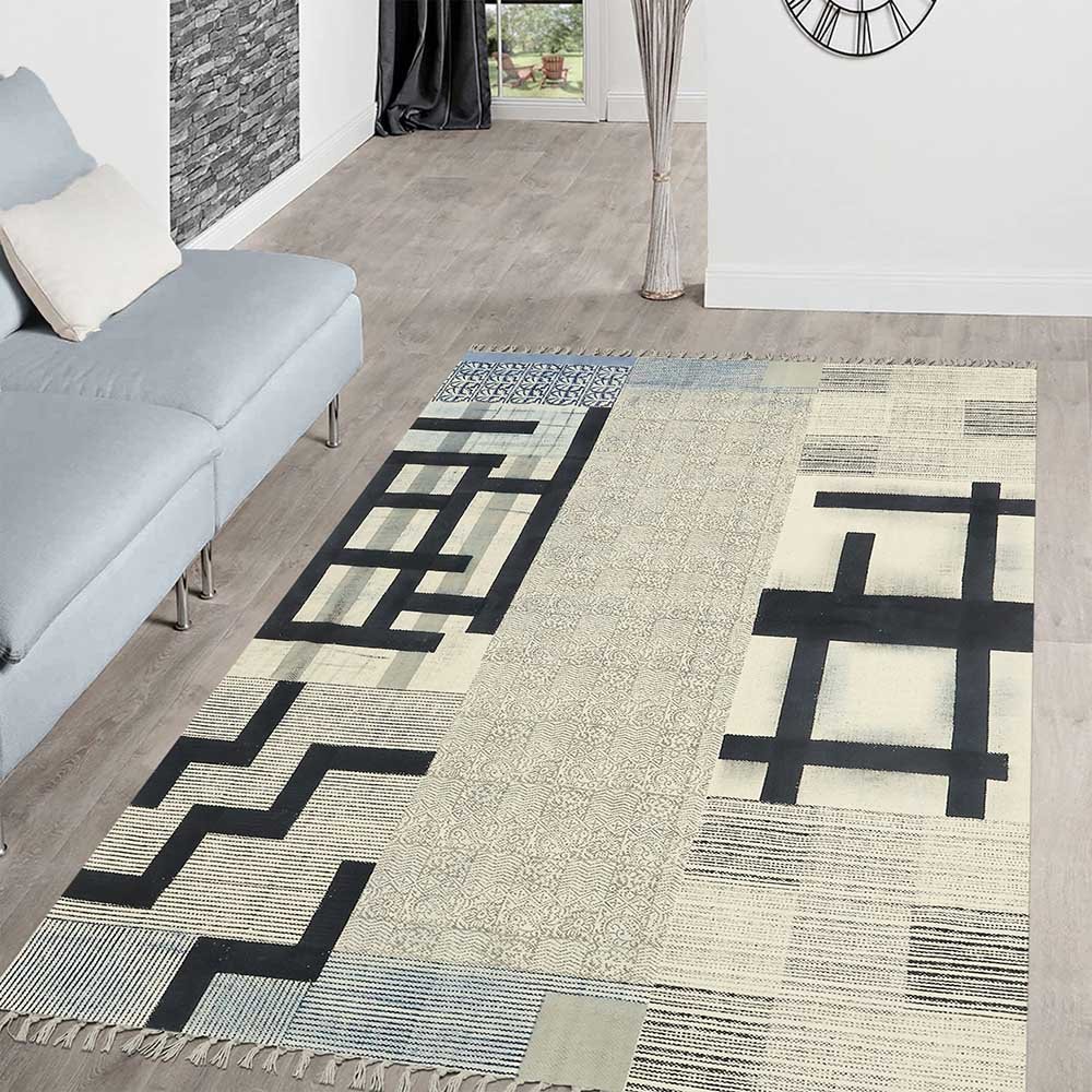 This is a beautiful handmade Cotton kilim rug weaved on Indian looms stamped with natural vegetable-dyes using hand-made wooden blocks achieving the perfection of block printing art of Jaipur. This is best suitable for your home office entrance, bedroom, living room, kids room, dining room, kitchen,outdoor patio, terrace, beach and garden.