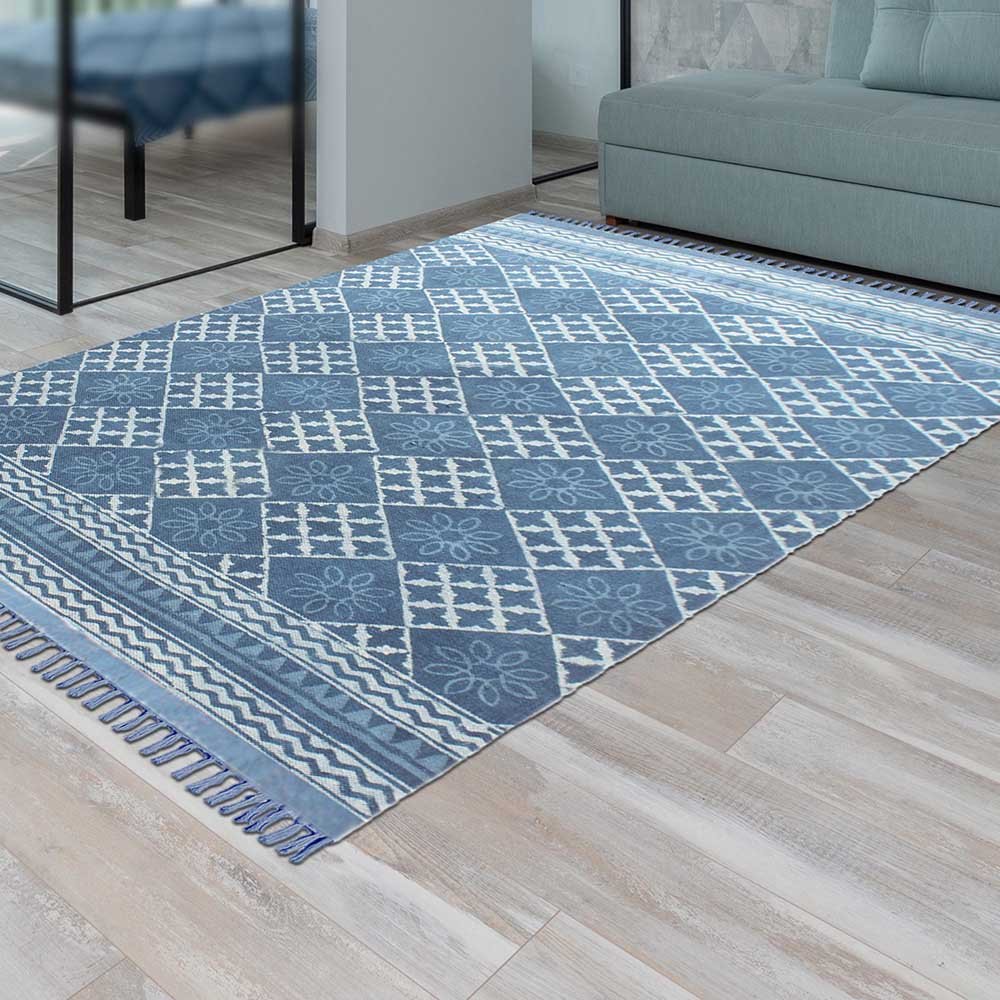 This is a beautiful handmade Cotton kilim rug weaved on Indian looms stamped with natural vegetable-dyes using hand-made wooden blocks achieving the perfection of block printing art of Jaipur. This is best suitable for your home office entrance, bedroom, living room, kids room, dining room, kitchen,outdoor patio, terrace, beach and garden.