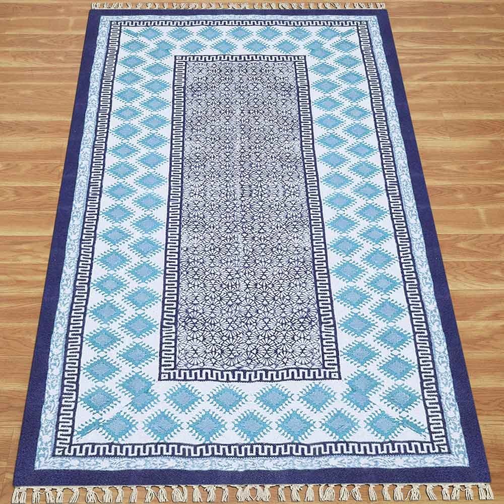 This is a beautiful handmade Cotton kilim rug weaved on Indian looms stamped with natural vegetable-dyes using hand-made wooden blocks achieving the perfection of block printing art of Jaipur. This is best suitable for your home office entrance, bedroom, living room, kids room, dining room, kitchen,outdoor patio, terrace, beach and garden.
