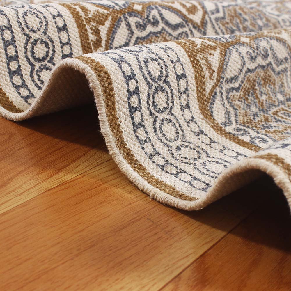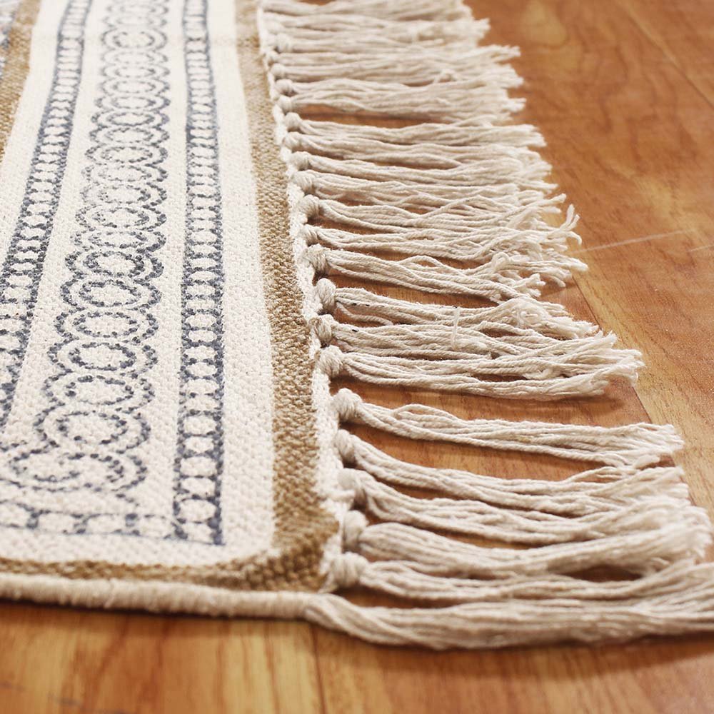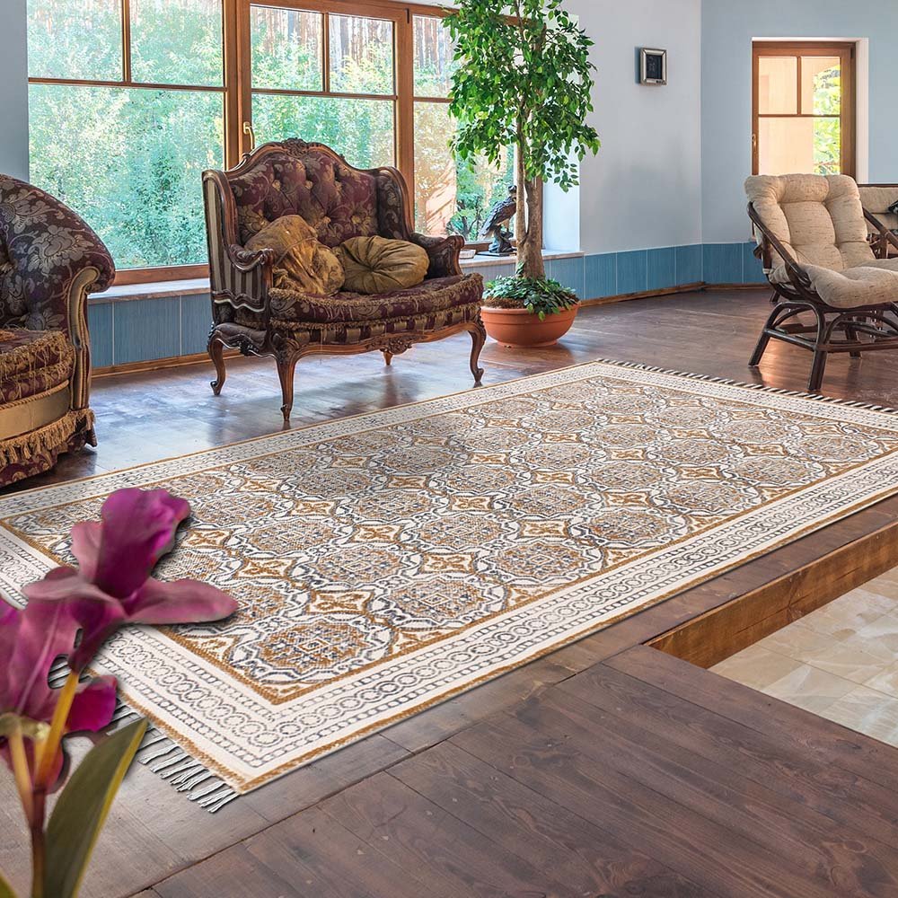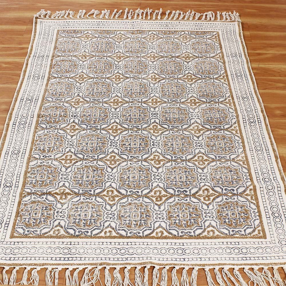 This is a beautiful handmade Cotton kilim rug weaved on Indian looms stamped with natural vegetable-dyes using hand-made wooden blocks achieving the perfection of block printing art of Jaipur. This is best suitable for your home office entrance, bedroom, living room, kids room, dining room, kitchen,outdoor patio, terrace, beach and garden.