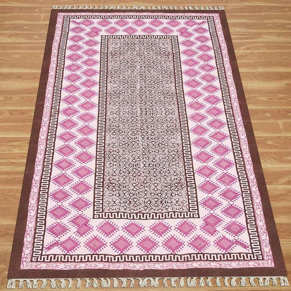 This is a beautiful handmade Cotton kilim rug weaved on Indian looms stamped with natural vegetable-dyes using hand-made wooden blocks achieving the perfection of block printing art of Jaipur. This is best suitable for your home office entrance, bedroom, living room, kids room, dining room, kitchen,outdoor patio, terrace, beach and garden.