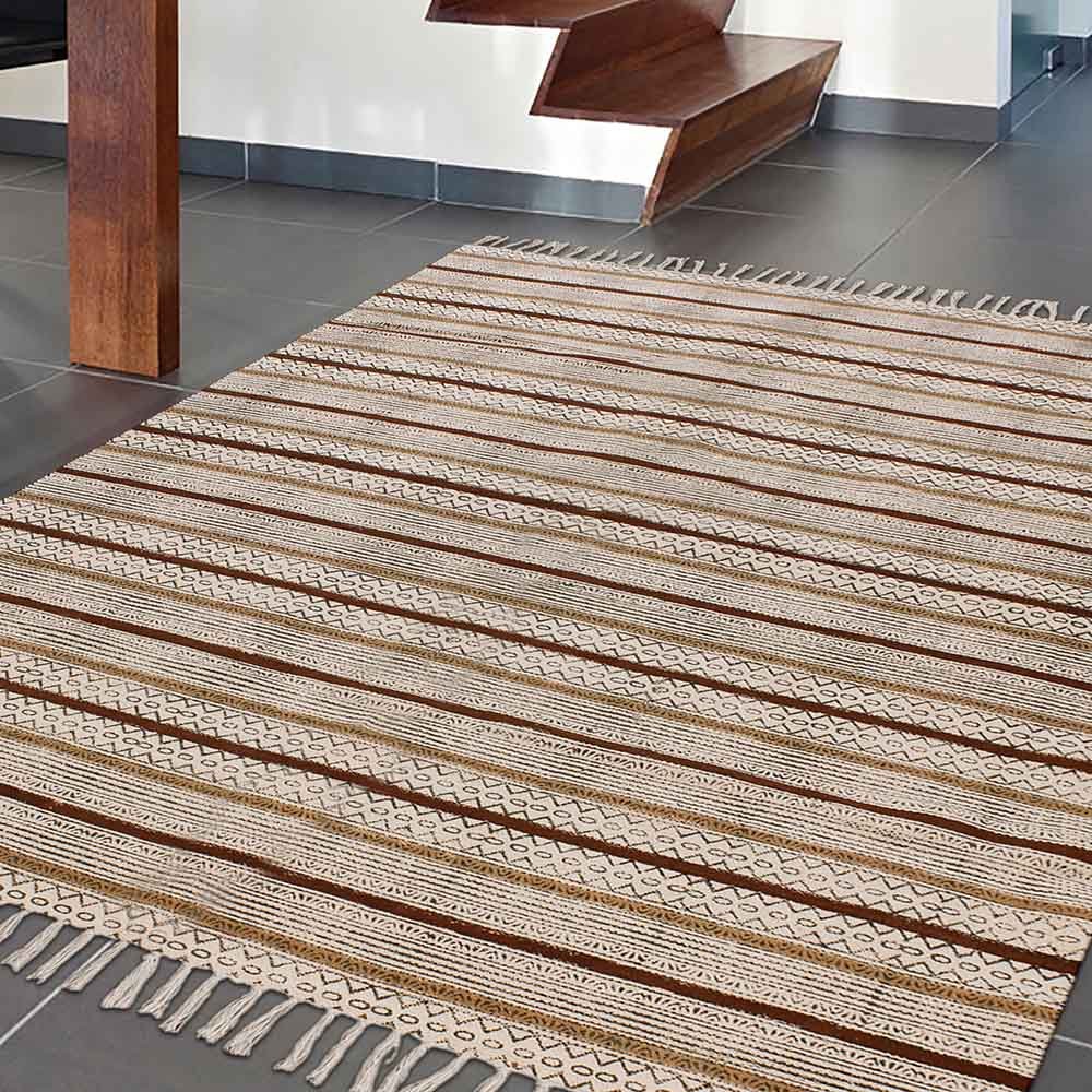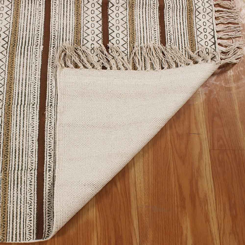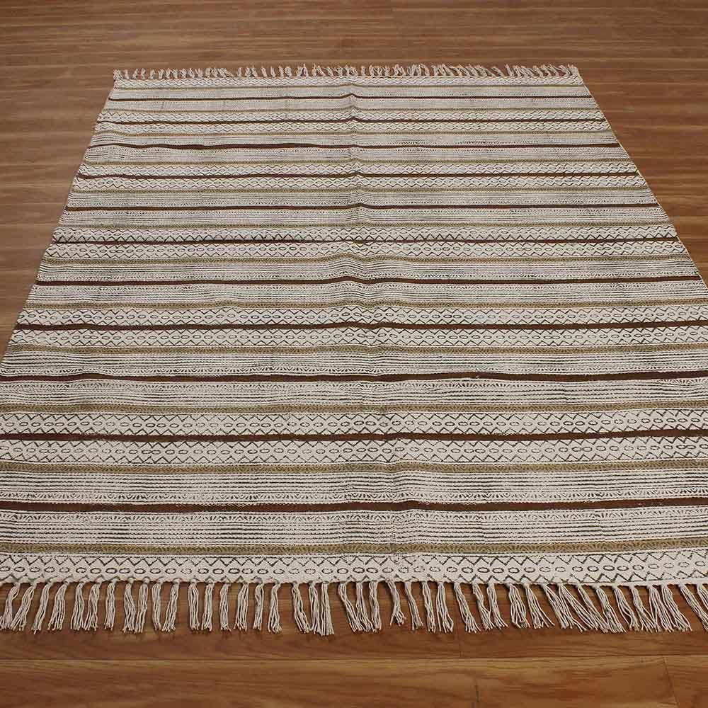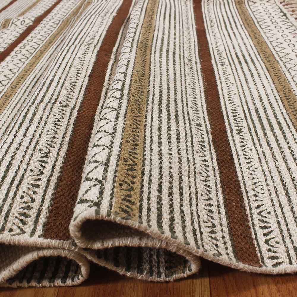 Hand Block Printed Cotton Striped Brown Rug