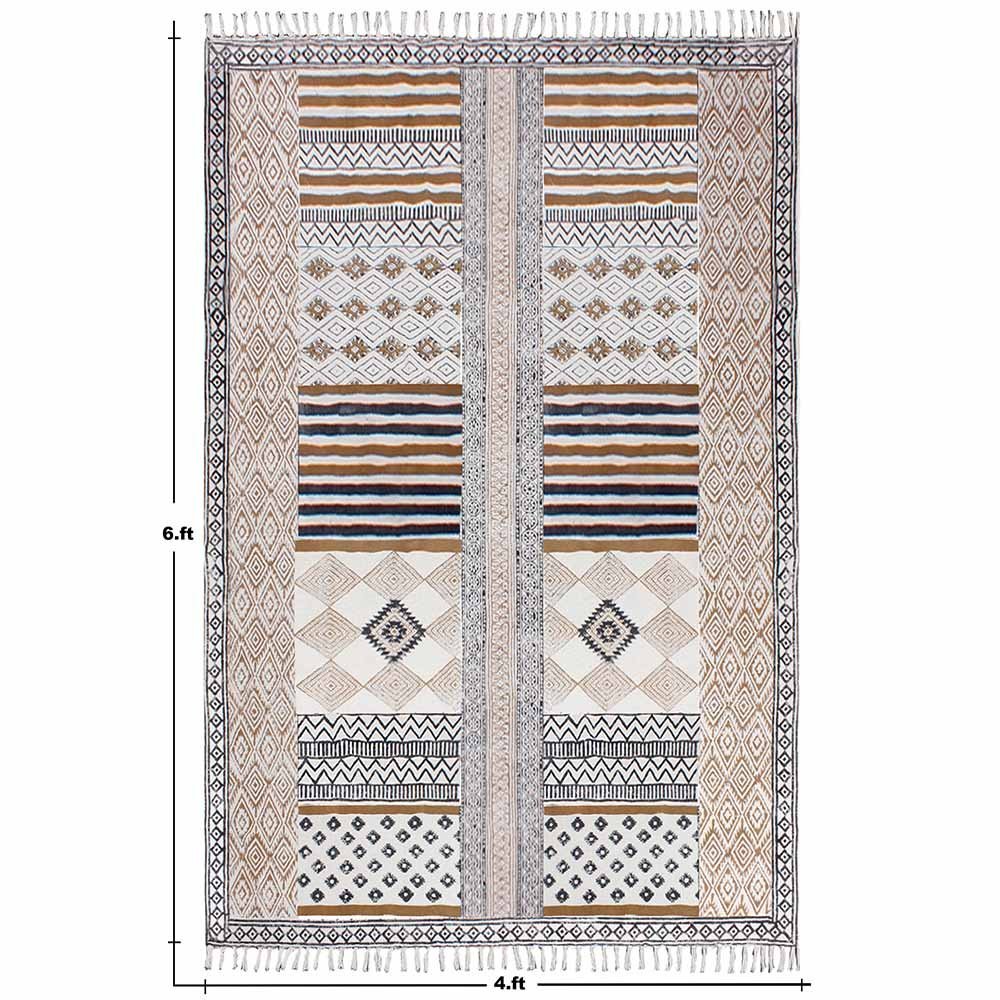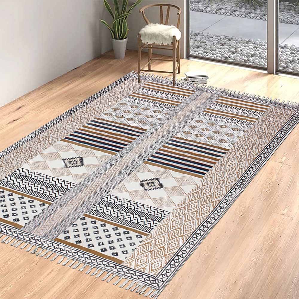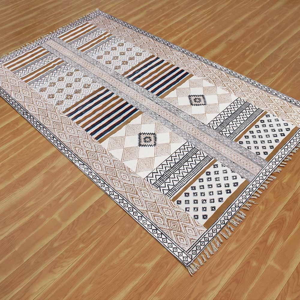 This is a beautiful handmade Cotton kilim rug weaved on Indian looms stamped with natural vegetable-dyes using hand-made wooden blocks achieving the perfection of block printing art of Jaipur. This is best suitable for your home office entrance, bedroom, living room, kids room, dining room, kitchen,outdoor patio, terrace, beach and garden.