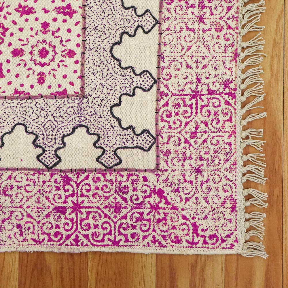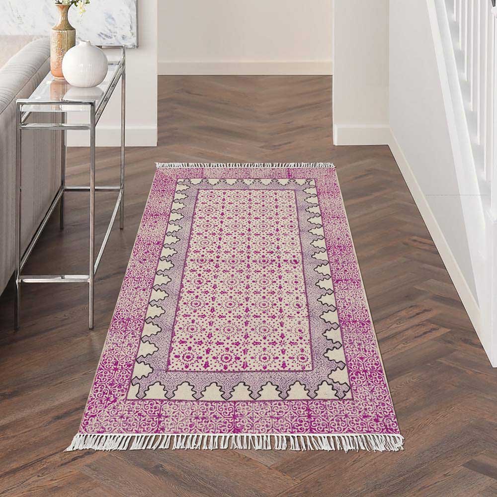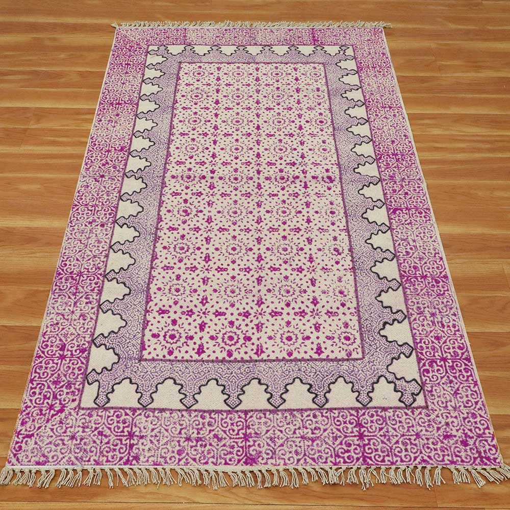 This is a beautiful handmade Cotton kilim rug weaved on Indian looms stamped with natural vegetable-dyes using hand-made wooden blocks achieving the perfection of block printing art of Jaipur. This is best suitable for your home office entrance, bedroom, living room, kids room, dining room, kitchen,outdoor patio, terrace, beach and garden.