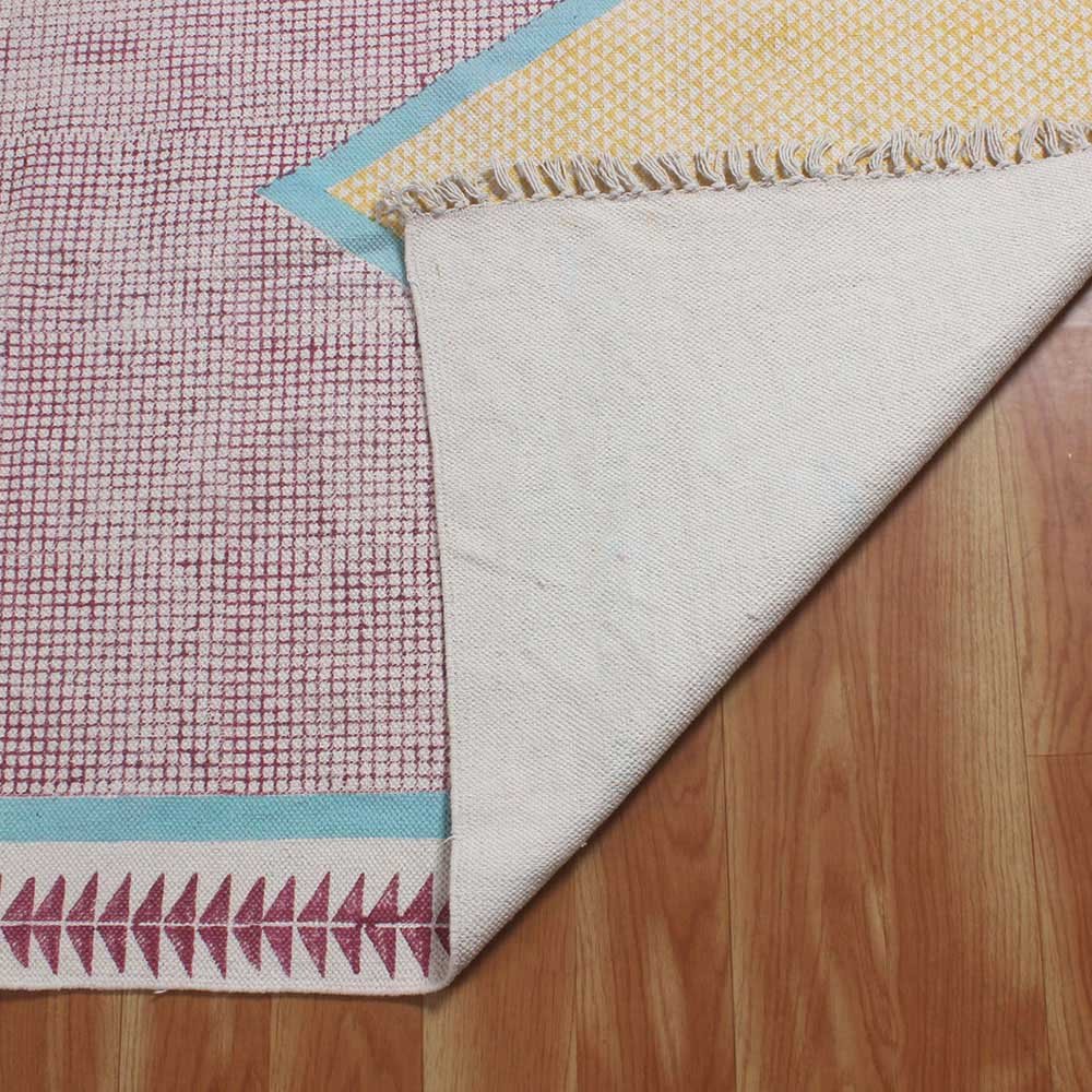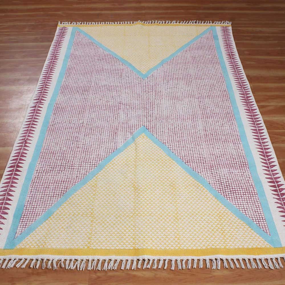 This is a beautiful handmade Cotton kilim rug weaved on Indian looms stamped with natural vegetable-dyes using hand-made wooden blocks achieving the perfection of block printing art of Jaipur. This is best suitable for your home office entrance, bedroom, living room, kids room, dining room, kitchen,outdoor patio, terrace, beach and garden.