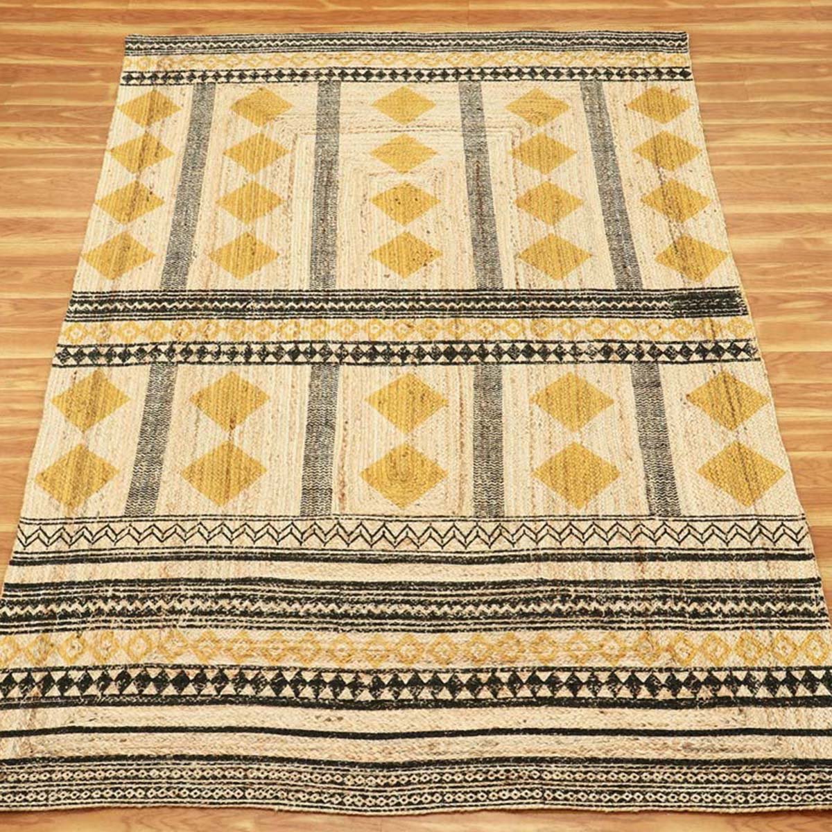 This rug is 100% handmade with natural jute yarns, making it eco-friendly. Jute is the second most cultivated vegetable fiber in the world, after cotton. We use traditional hand block printing techniques to create unique designs on the rug, adding a special touch to its beauty. Our process is entirely eco-friendly, from cultivating the jute to hand-weaving the yarns and block printing.