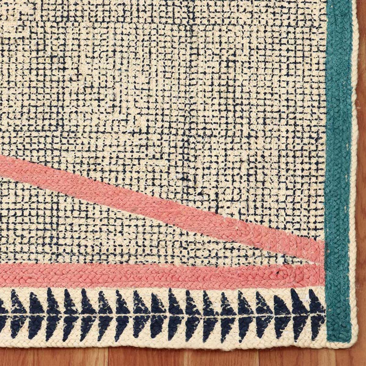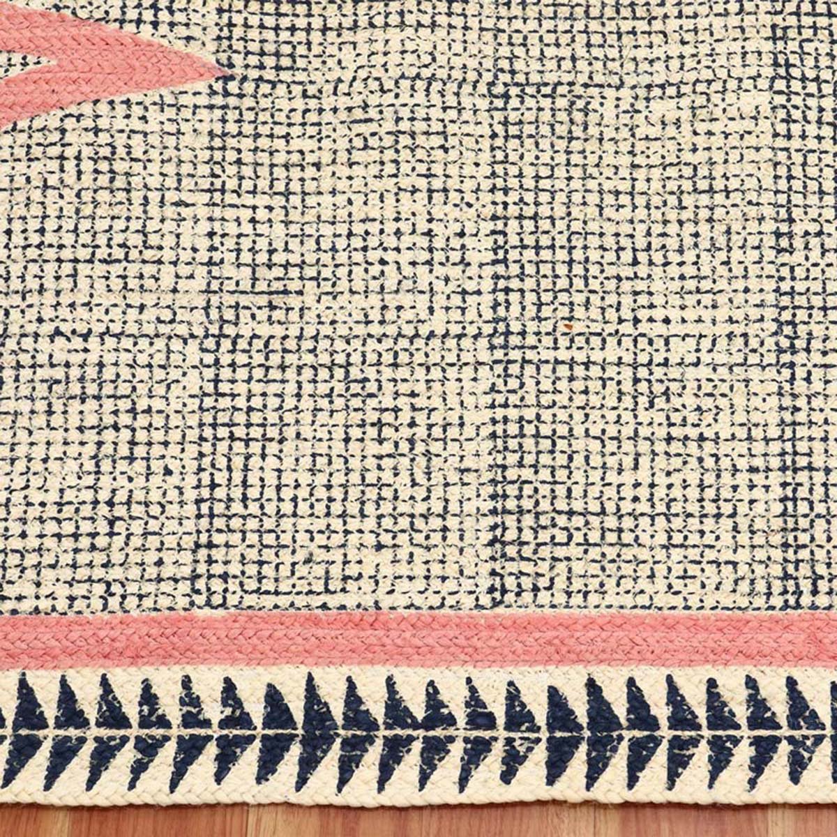 Handmade Block Printed Blue Pink Jute Rug