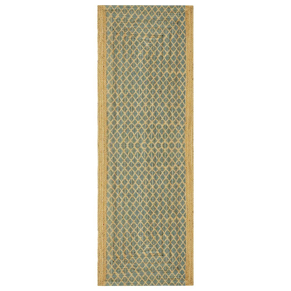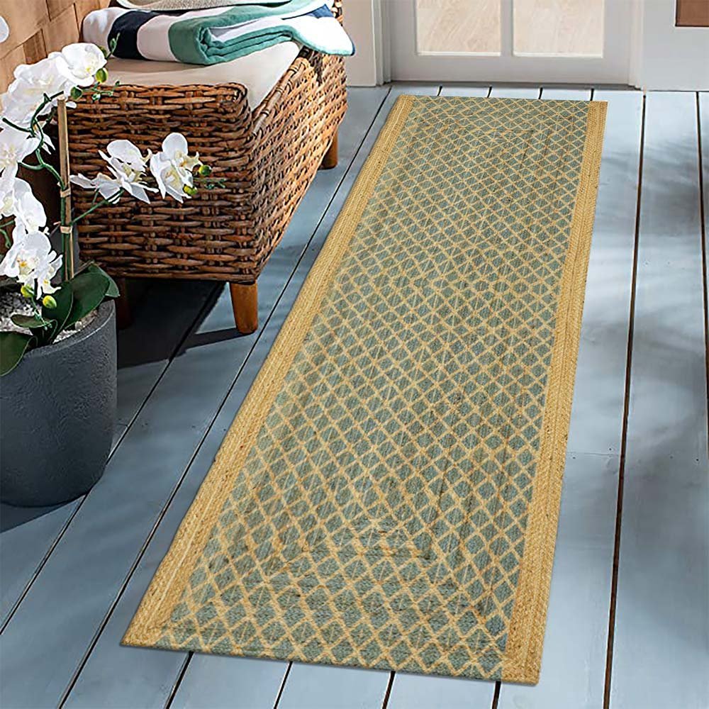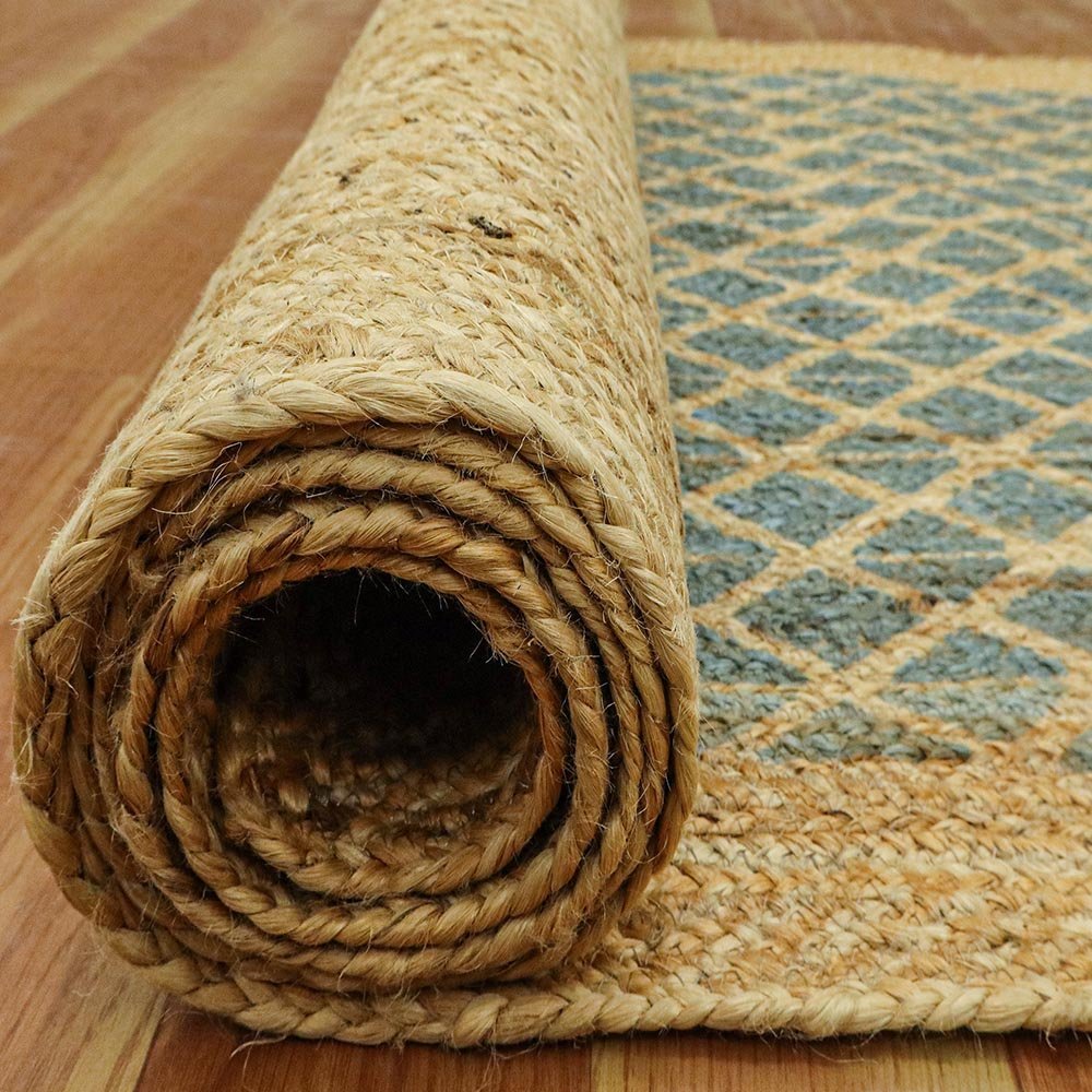 Handmade Green Jute Rug With Classic Block Printed Design
