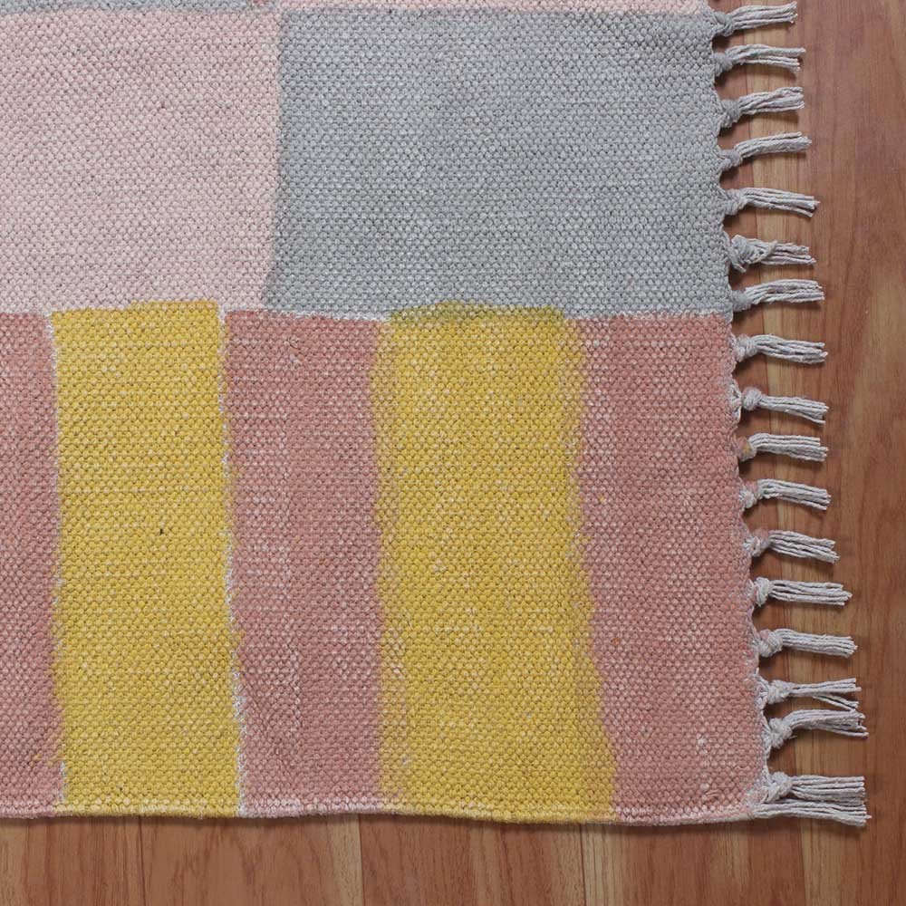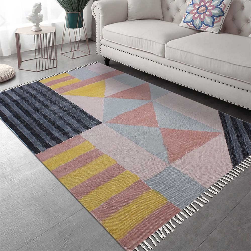 This is a beautiful handmade Cotton kilim rug weaved on Indian looms stamped with natural vegetable-dyes using hand-made wooden blocks achieving the perfection of block printing art of Jaipur. This is best suitable for your home office entrance, bedroom, living room, kids room, dining room, kitchen,outdoor patio, terrace, beach and garden.