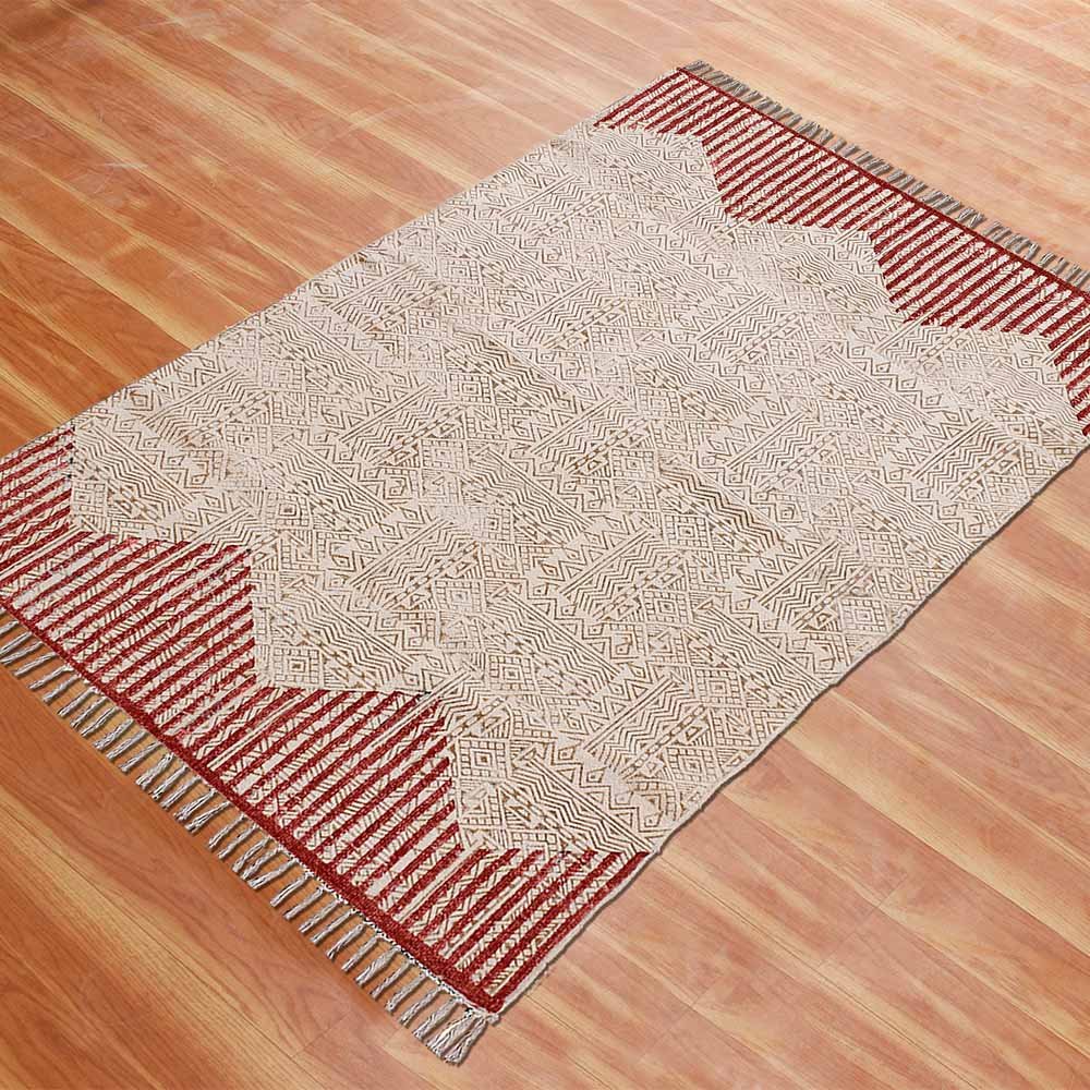 This is a beautiful handmade Cotton kilim rug weaved on Indian looms stamped with natural vegetable-dyes using hand-made wooden blocks achieving the perfection of block printing art of Jaipur. This is best suitable for your home office entrance, bedroom, living room, kids room, dining room, kitchen,outdoor patio, terrace, beach and garden.