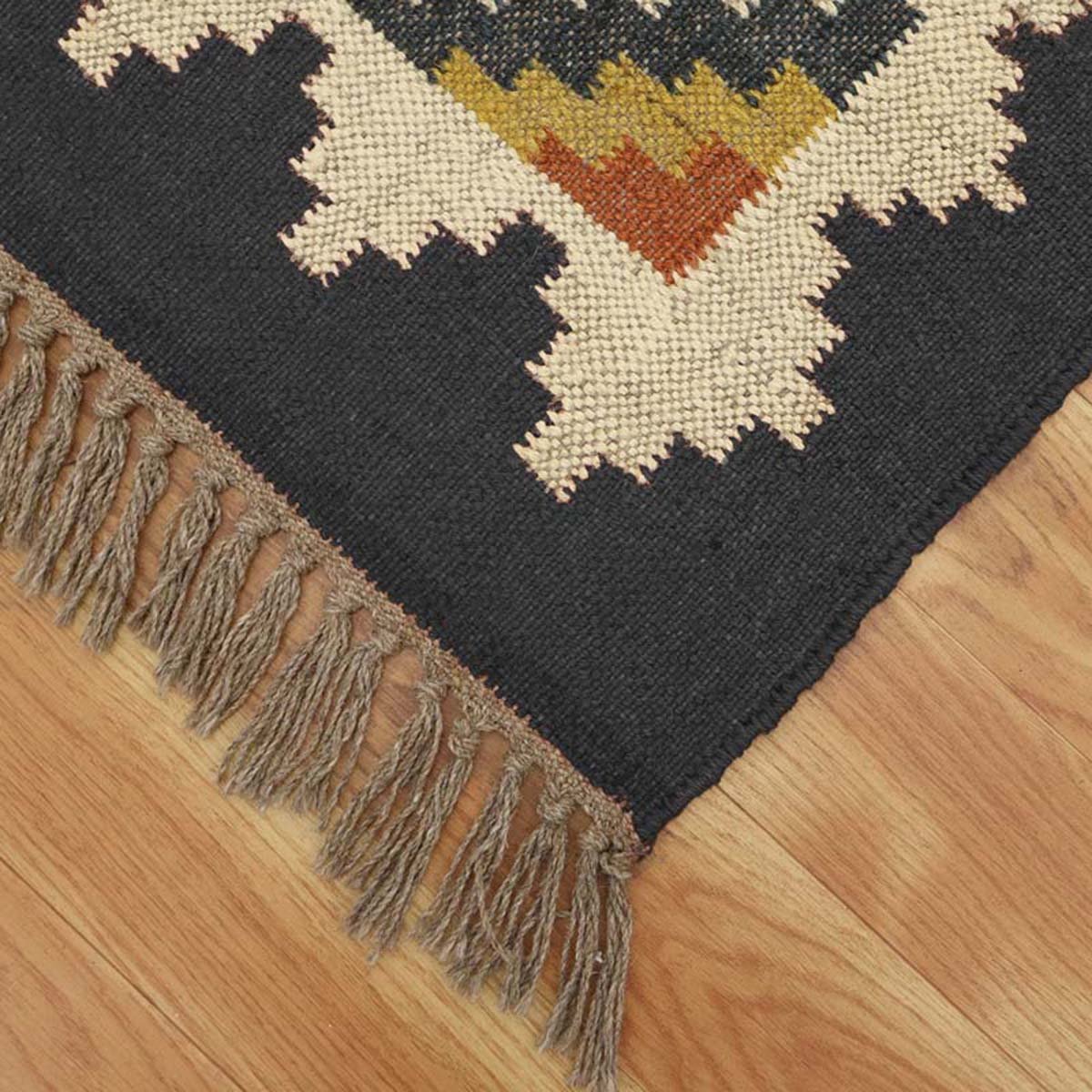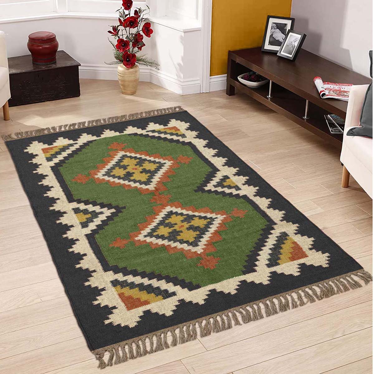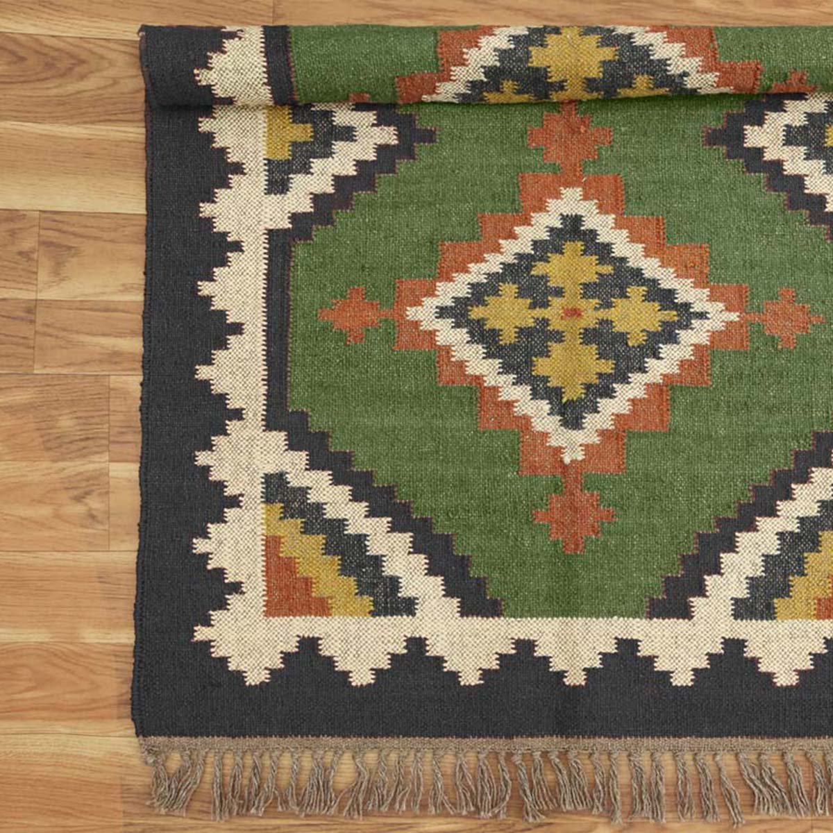 The rug is the result of a 100% handmade process using natural wool and jute, both of which are 100% eco-friendly. Jute, the second most cultivated vegetable fiber in the world after cotton, and wool are meticulously handwoven to create this beautiful rug. The manufacturing process of this wool and jute rug is entirely handcrafted and eco-friendly, starting from the cultivation of natural jute fiber to the hand-weaving of these jute yarns.